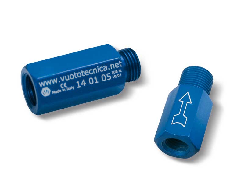 Fitted on the vacuum pump suction inlet, as soon as the latter stop, these valves prevent the air from returning in the plant (piping, tanks, autoclaves, vacuum gripping systems, vacuum cups, etc.), guaranteeing a perfect seal and preventing the oil from returning into the pump stator, which would cause considerable damages.
