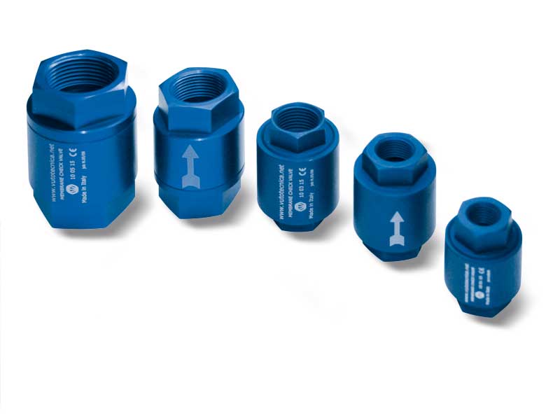 These valves have the same features of the previously described check valves, but they are made with anodised aluminium, which makes them particularly light. The seal is guaranteed by an EPDM membrane instead of the metal shutter with NBR seal.
