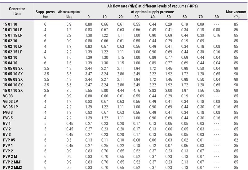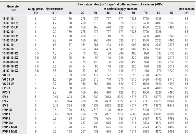 该发生器具有极高的效率,只需使用非常低的压缩空气(2-3 bar),真空值高达-72KPa,流量在1-4 m3/h之间。