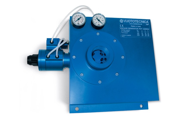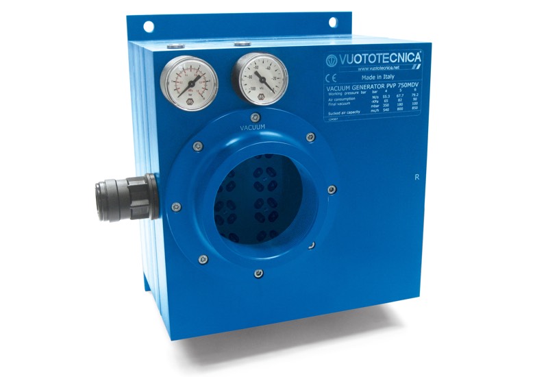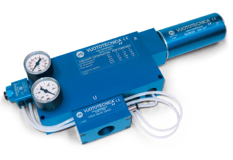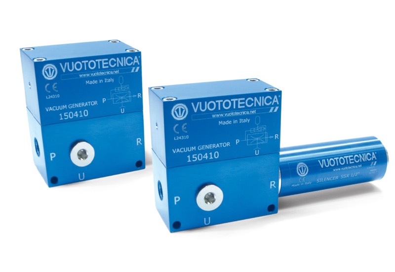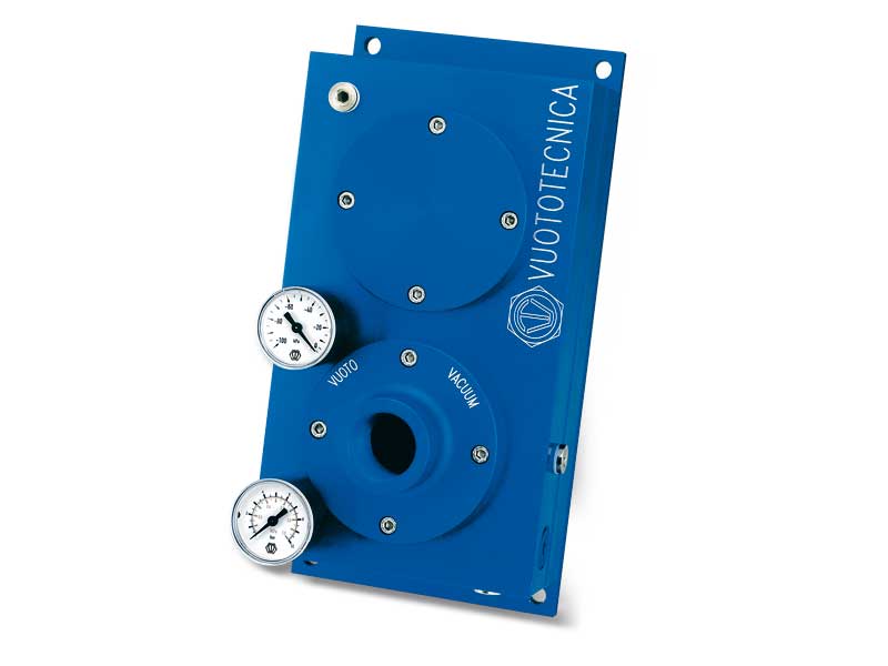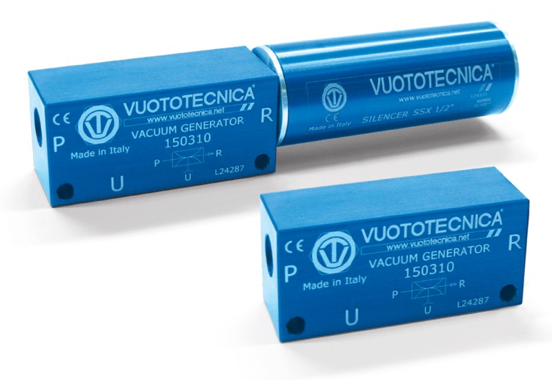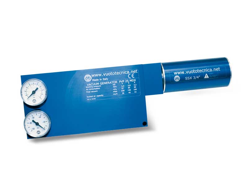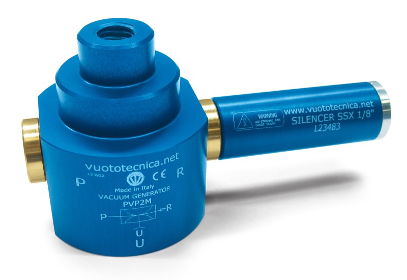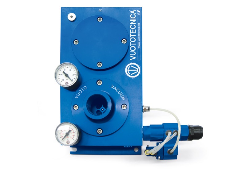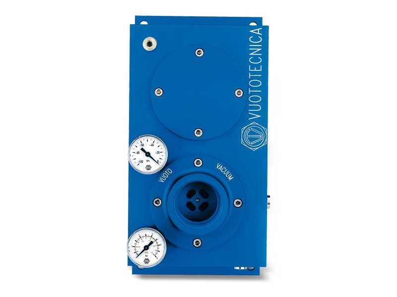 所配备的接头可以固定Ø200 mm以上的扁平吸盘,根据要求可提供特殊的适配接头,用于连接到远程真空发生器上。在吸入空气的排气口安装了一个高降噪型“自由流动”消音器,该消音器配备有特殊的安全保护装置,以防止吸入的固体杂质扩散到工作环境中。