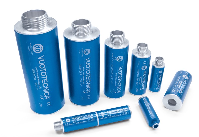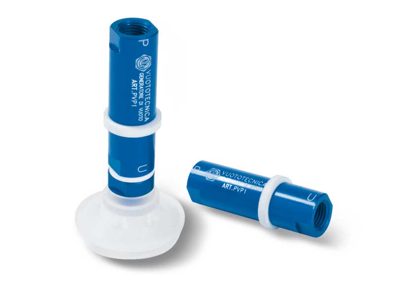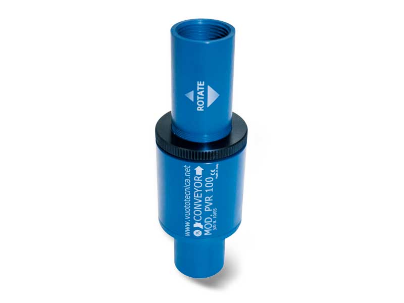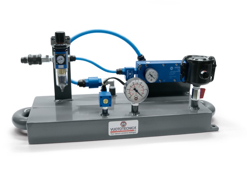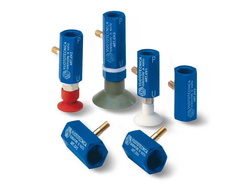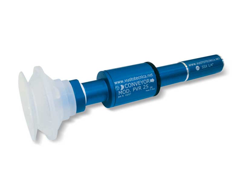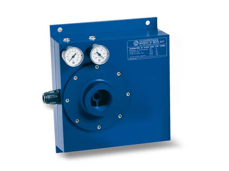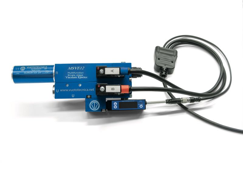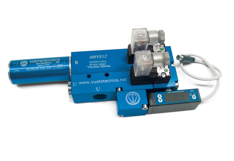所配备的接头可以固定Ø200 mm以上的扁平吸盘,根据要求可提供特殊的适配接头,用于连接到远程真空发生器上。在吸入空气的排气口安装了一个高降噪型“自由流动”消音器,该消音器配备有特殊的安全保护装置,以防止吸入的固体杂质扩散到工作环境中。