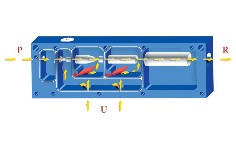 这些单级真空发生器的运行基于文丘里原理。通过向发生器中P供应压缩空气,会在连接U处产生负压,并将带有进气的供应空气排放到R中;同时,在工作循环中使真空储能装置具有一定的空气压力,当中断进气口P时,就会通过接口U释放储存的压缩空气,从而在工作点迅速恢复大气压力。