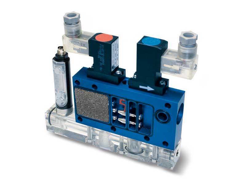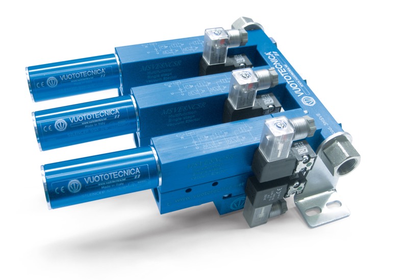 迷你真空泵组和泵组的气动控制组件的尺寸可确保向安装在其之上的真空发生器供应适量、恒定和连续的压缩空气。