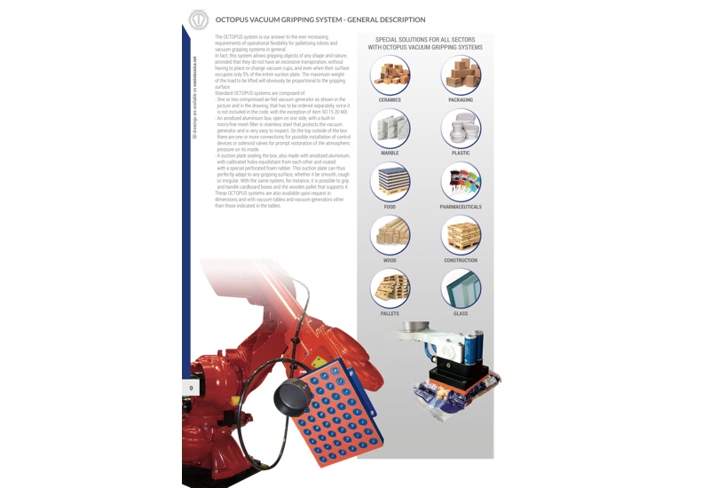 专为抓取装有粉末、颗粒、散装产品或液体的纸袋或塑料袋而设计的吸板,与章鱼式系统相结合,可以发挥其最大的性能。由阳极氧化铝制成,采用一种特殊的泡沫橡胶密封圈,完全可与章鱼式系统的标准吸板互换使用。密封圈和支撑面的特殊构造确保在抓持过程中减少袋子的变形,最大程度减少真空损失,并确保最大的吸取面积。