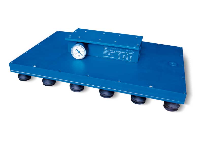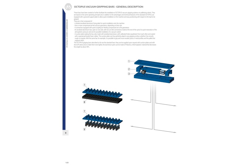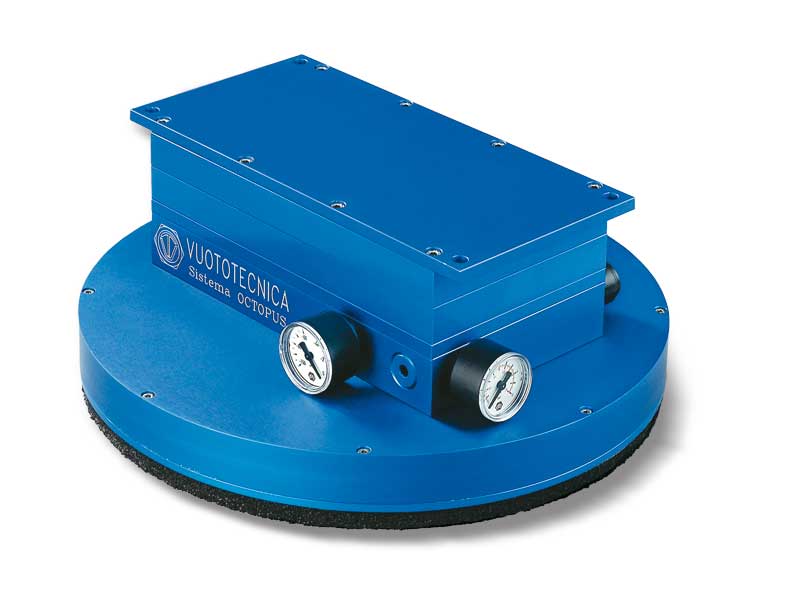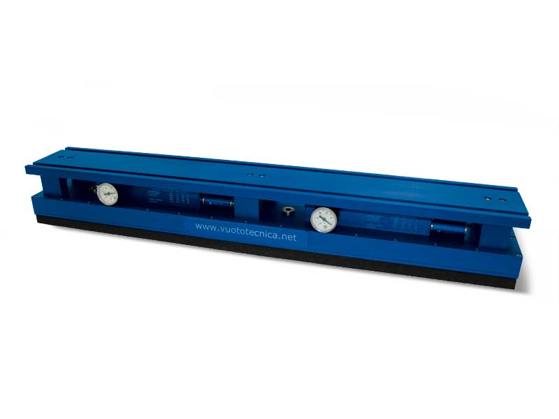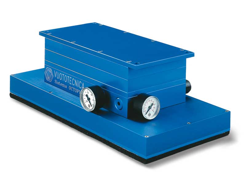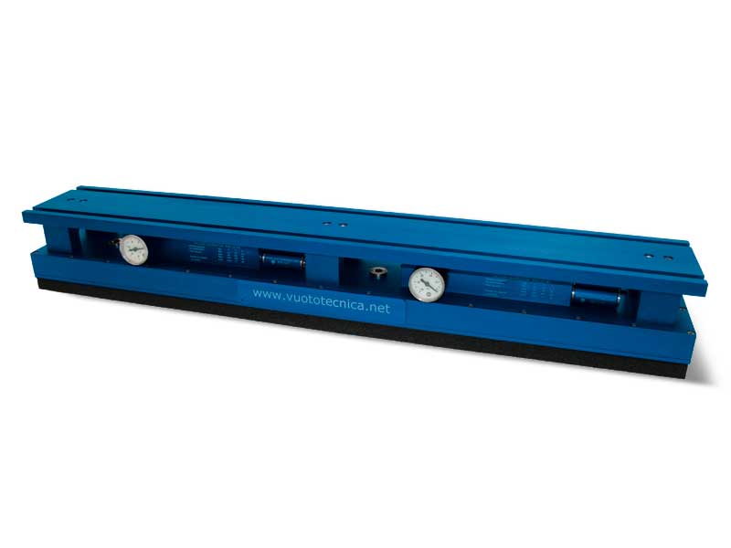 - 一个阳极氧化铝制成的吸板,具有等距校准孔,表面覆盖一块特殊的有孔泡沫橡胶。这样设计的吸板可完美适应任何抓取表面,包括光滑、粗糙或不规则的表面。用这种条状吸板可以提取和搬运木梁或金属型材及其支撑托盘。