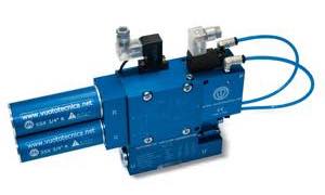 A microsolenoid valve for the compressed air supply (activation suction) and another for the counter blow management (to speed the release of the suction cups), with adjustment screw for the flow rate.