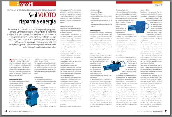 The monthly magazine “I quaderni dell’Aria Compressa” will go in-depth into Vuototecnica product guarantees, devoting two pages of its March 2011 issue to two Vuototecnica vacuum solutions.