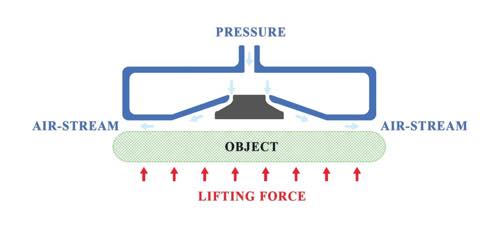 BEC are fed with compressed air and are also defined as suction cups without contact as there is always a flow of lamellar air between the taken object and the plane of the suction cup in aluminum. The suction cups use Bernoulli’s theorem, the same for which it is possible to interpret the effect of lift of the wings of an aircraft.