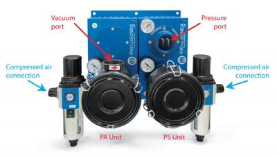 The pumps can be controlled individually, and this allows high quality and a strong increase in productivity. The pneumatic pumps are based on the Venturi principle, this prevents downtime. Depending on the supply air pressure, it is possible to adjust the vacuum degree (or the pressure degree) and the pumps flow rate.