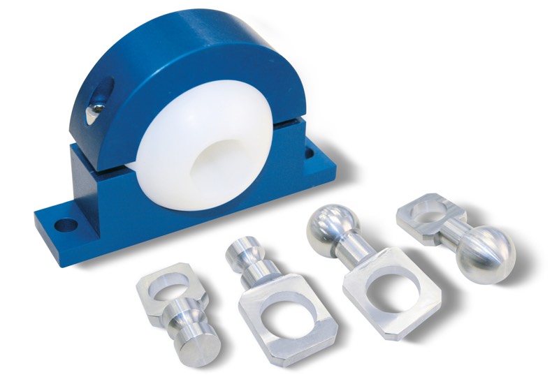 用于将支杆固定到自动化设备的固定支架为铝制,由两个部分构成,相互之间通过螺钉连接,该固定支架可锁定球形联轴节,从而将吸盘缓冲支杆保持在适当位置上。