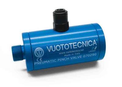 The pneumatic coaxial sleeve valve, code 07 02 90, was designed to intercept the compressed exhaust air of single stage vacuum generators through a silicone sleeve membrane.