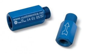 Vuototecnica has also thought of this possibility and proposes their 14..11 series self-closing valves with the same functions as those just described but with controlled loss. The grip shutter of these valves allows for minimum suction even when closed, thus allowing the suction cup grip to simply rest again on the surface of the object to be withdrawn. The lowering of the degree of the vacuum, in the absence of an object to be withdrawn, remains controlled and recovered by the flow field of the vacuum source. All Vuototecnica self-closing valves can work in any position and are made completely of anodized aluminium.